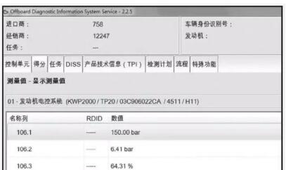 2 連接VAS6150B,在“01—發(fā)動(dòng)機(jī)電控系統(tǒng)”中讀取106組燃油系統(tǒng)壓力值,發(fā)動(dòng)機(jī)怠速和3000r/min時(shí),106.2區(qū)測(cè)試結(jié)果分別是6.00bar和6.41bar,如下圖所示。