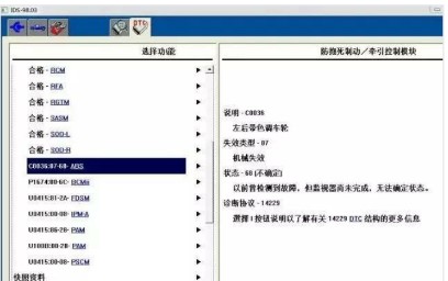 用IDS對(duì)車輛進(jìn)行檢測,讀取到多個(gè)故障代碼(圖2),分析可知,故障代碼都與ABS系統(tǒng)有關(guān),于是決定從ABS系統(tǒng)入手,對(duì)故障進(jìn)行排查。在上述故障代碼中與ABS有關(guān)的故障代碼是“C0036:07-68-ABS”其含義為左后帶色調(diào)車輪機(jī)械失效(圖3),除此之外,大多是與通信網(wǎng)絡(luò)有關(guān)的故障代碼,初步判斷故障原因可能是ABS系統(tǒng)故障影響到了其他系統(tǒng)的正常工作。分析認(rèn)為故障代碼“C0036:07-68-ABS”產(chǎn)生的原因可能有左后傳感器故障,信號(hào)齒圈有問題,ABS控制模塊及其相關(guān)線路故障等。