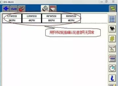 本著由簡到繁的原則對(duì)上述故障點(diǎn)進(jìn)行排查,首先用舉升機(jī)將車輛舉起,轉(zhuǎn)動(dòng)車輪,查看ABS控制模塊里的4個(gè)輪速信號(hào)(圖4),無異常,只要轉(zhuǎn)動(dòng)車輪,IDS內(nèi)的數(shù)據(jù)就會(huì)有變化。明明輪速信號(hào)正常,為什么會(huì)記錄故障代碼呢?