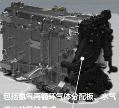 此外,奔馳GLC F-CELL為提升燃料電池系統(tǒng)功率密度,對相關(guān)零部件進(jìn)行了高度集成開發(fā),比如對進(jìn)氣端板集成化,即將水氣進(jìn)出歧管和氫氣再循環(huán)分配板高度總成;集成多個空氣部件,如加濕器和水氣分離器集成等。