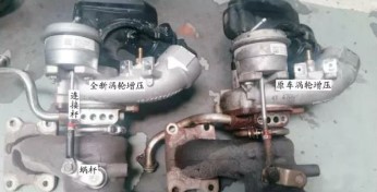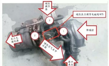 故障診斷:發(fā)動機(jī)排放燈點亮,當(dāng)然是發(fā)動機(jī)控制單元監(jiān)測到相關(guān)系統(tǒng)存在會導(dǎo)致排放增加的故障,才點亮故障燈提示報警。對這些故障,當(dāng)然首先去讀取發(fā)動機(jī)系統(tǒng)故障。連接VAS6150檢測發(fā)動機(jī)系統(tǒng),果然存在一個故障碼P0299增壓壓力控制沒有達(dá)到控制極限。再看故障碼的環(huán)境條件是:行駛里程47729km,優(yōu)先權(quán)2,故障頻率計數(shù)器1,計數(shù)器未學(xué)習(xí)255,發(fā)動機(jī)轉(zhuǎn)速2451.00r/min,標(biāo)準(zhǔn)負(fù)荷值67.8%,車速98km/h,冷卻液溫度92℃,進(jìn)氣溫度47℃,環(huán)境氣壓100kPa,端子30電壓13.735V,動態(tài)環(huán)境數(shù)據(jù)20 96 28 11 AC 05 FB 12 8C 00 00 0E 31 13 38 07 12 16 11 DD 10 10 06FC。根據(jù)故障碼的指向,接下來圍繞渦輪增壓器來做相應(yīng)的檢查了。實車渦輪增壓器如圖1所示。