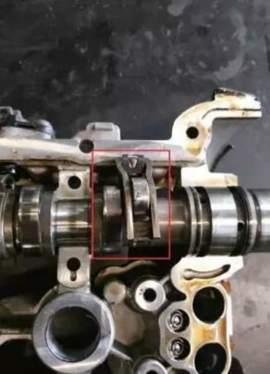 為使故障更直觀,決定進(jìn)行路試。路試過程發(fā)現(xiàn)該車在非怠速工況行駛穩(wěn)定無明顯的動(dòng)力不足現(xiàn)象,說明故障主要在怠速工況嚴(yán)重。根據(jù)之前分析試對調(diào)了火花塞、點(diǎn)火線圈、噴油器, 故障沒有改善。檢查汽缸壓力,各缸均在1100kPa左右相差很小。按單缸失火原因分析可能是液壓挺柱泄壓或是氣門不密封,決定先拆解凸輪軸檢查液壓挺柱。拆解第二列汽缸蓋凸輪軸后發(fā)現(xiàn),6缸排氣側(cè)其中一個(gè)凸輪頂圓部分和其對應(yīng)的液壓挺柱帶搖臂的滾輪產(chǎn)生了不正常的磨損,如圖2所示。