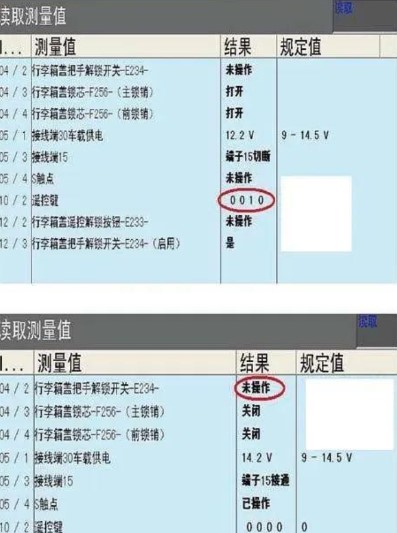 首先將遙控鑰匙重新匹配后故障仍然存在,用 6150 讀取數(shù)據(jù)流,從左前門開關(guān) E233 開啟時(shí)數(shù)據(jù)變化正常,遙控鑰匙開啟時(shí)數(shù)據(jù)有變化但是后備箱沒有開啟(如圖 1、 圖 2 所示) 。
