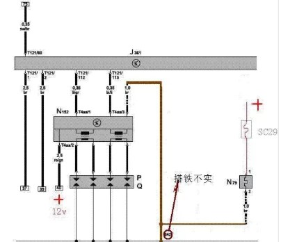 點火線圈的二號針腳接的是從J363(SIMOS控制單元供電繼電器)經(jīng)過SB14保險絲過來的12V正電; 第一和第三針腳接的是J361(發(fā)動機控制單元)的控制端,其中一號腳控制一四缸的點火,三號腳控制的是二三缸的點火。就是說,發(fā)動機正常工作時,當一缸在壓縮上止點時,J361會斷開一號腳的接地,從而在一四缸的次級線圈產(chǎn)生感應電壓,點燃一缸混合氣,一缸作功。測量一三腳到J361線路,正常。參照電路圖可以看出:點火線圈的接地線也是曲軸箱通風加熱電阻N79的搭鐵線,N79的一號針腳接的是從J519(中央電器控制單元)經(jīng)過SC29保險絲過來的12V正電。試想,如果642搭鐵點搭鐵不良,J519的正電會經(jīng)過N79直接和點火線圈的四號針腳相連,這樣點火線圈的初級回路就被阻斷,造成無法點火,發(fā)動機控制單元J361會記錄點火線圈對正極短路故障。檢查642搭鐵線,在發(fā)動機空氣濾清器下面,發(fā)現(xiàn)642搭鐵點的固定螺母已經(jīng)松動。清理搭鐵點,重新固定好,換上新的點火線圈。
