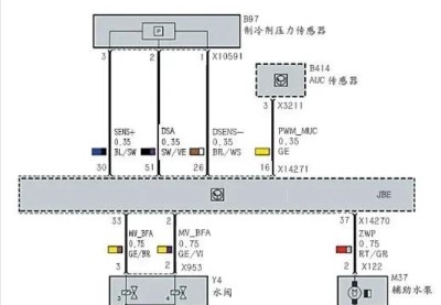 首先排除空調(diào)不制冷故障。啟動發(fā)動機,開啟空調(diào)后,壓縮機不工作,檢查制冷高低壓管路壓力正常,由于存在制冷劑壓力傳感器故障,接下來對制冷劑壓力傳感器進行檢查。拔下傳感器B97上的插頭(如圖1所示),打開點火開關(guān),檢查插頭線束側(cè):3號腳藍/黑線對應(yīng)插針上有5V供電(標準電壓5V)正常;2號腳黑/褐線對應(yīng)插針上也是5V的電壓(標準電壓5V)正常;1號腳 棕/白線對應(yīng)插針上有12V的電壓。對照電路圖(如圖2所示)可知,該棕/白線為制冷劑壓力傳感器的搭鐵線,正常情況下電壓應(yīng)為0,而此處卻有12V的電壓,很顯然制冷劑壓力傳感器的供電系統(tǒng)出現(xiàn)故障,傳感器的搭鐵線與正極短路所致。由電路圖可知,該傳感器由接線盒電子裝置(JBE)控制,為了確定短路的大致位置,關(guān)閉點火開關(guān),拔下JBE上藍色插頭X14271,再次測量制冷劑壓力傳感器B97插頭線束側(cè),電壓分別為0,且三根線之間相互無短路。測量B97傳感器棕/白接地線與正極之間,無論打開還是關(guān)閉點火開關(guān)也不存在短路,說明從制冷劑壓力傳感器插頭到接線盒電子裝置(JBE)插頭之間的導(dǎo)線不存在故障。