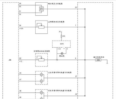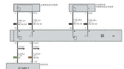 接下來排除油表不準的故障。該車在燃油箱的左側(cè)和右側(cè)各有一個燃油油位傳感器,這兩個滑線變阻式傳感器由接線盒電子裝置(JBE)提供12V電壓,該供電線也是信號線,反饋當前的油位信號。JBE在讀取這兩個油位信號后,將此測量值通過 K-CAN 總線傳遞給組合儀表,從而在組合儀表中顯示燃油箱中當前油量(如圖4所示)。