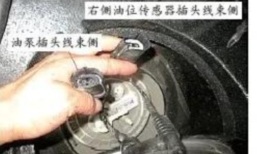 由于油位傳感器故障當前存在,所以首先排除該傳感器是否正常,撥下燃油泵上的插頭(如圖5所示), 在燃油泵側(cè)檢查右側(cè)油位傳感器的阻值,測量結(jié)果是101Ω,標準值50~1002Ω(50滿,1002空)。