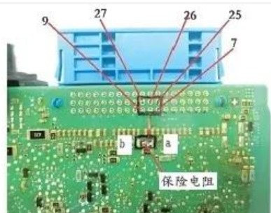 2.無論好的壞的JBE保險電阻a端與插頭X14271的7號、8號 、9號、 25號、26號、27號端子均相同通。對照電路圖測試,發(fā)現(xiàn)接線盒電子裝置(JBE)的搭鐵線為插頭X14270的23號、X1472的26號腳,而保險電阻的b端子與上述23號、26號腳均相通,如圖8、圖9所示。JBE端子說明如表所示。