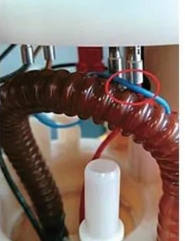 拆下燃油泵檢查,發(fā)現(xiàn)右側(cè)油位傳感器的搭鐵線(藍色線)有破損處,模擬燃油泵裝于燃油箱中的狀態(tài),發(fā)現(xiàn)該破損處正好與燃油泵供電線正極柱搭接短路,如圖11所示。