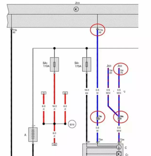 根據(jù)電路圖可知,如果出現(xiàn)熄火后風(fēng)扇常轉(zhuǎn),須滿足兩個(gè)條件。第一J293接收不到發(fā)動(dòng)機(jī)的T80/22號(hào)腳的信號(hào),第二必須滿足J293的T4p/2有供電(T4p/2供電路徑是A+→J271→SC44→T4p/2)。