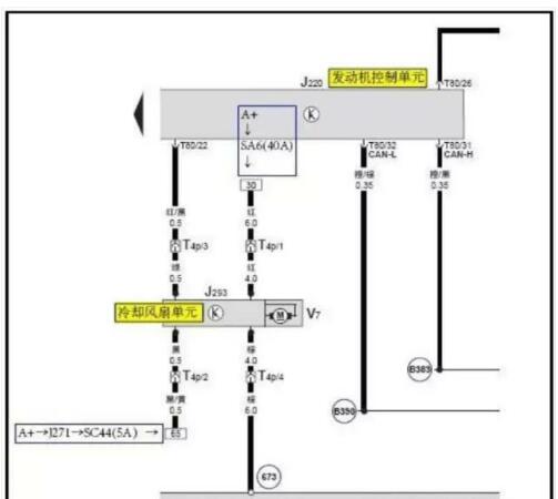 當(dāng)冷卻風(fēng)扇控制單元J293接收不到發(fā)動(dòng)機(jī)的T80/22號(hào)腳的信號(hào)時(shí),風(fēng)扇將進(jìn)入應(yīng)急模式保持常轉(zhuǎn)。