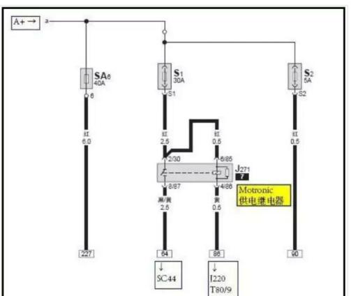 2、若J293的2號(hào)腳有電,須滿足SC44常有電,且J271繼電器吸合。根據(jù)維修站反映故障出現(xiàn)時(shí),拔去J271風(fēng)扇停止轉(zhuǎn)動(dòng),由此判斷SC44保險(xiǎn)絲后線路沒(méi)有短路。引起風(fēng)扇轉(zhuǎn)動(dòng)的原因是J271吸合造成。